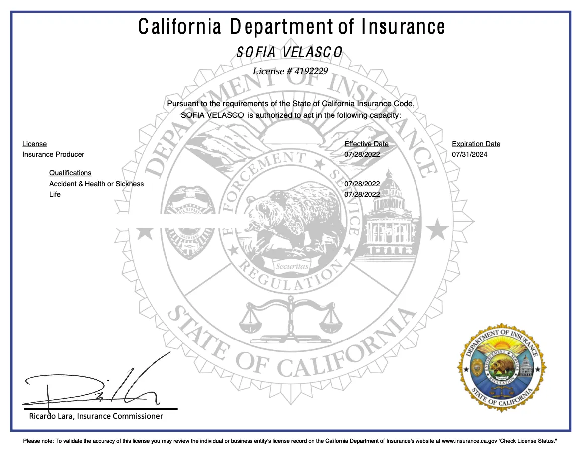 My name is Sofia Velasco, I am a Licensed Broker & Senior Field Underwriter licensed in multiple states. For the last 5 years I've been able to help my clients in finding the best, most affordable coverage for them and their families.